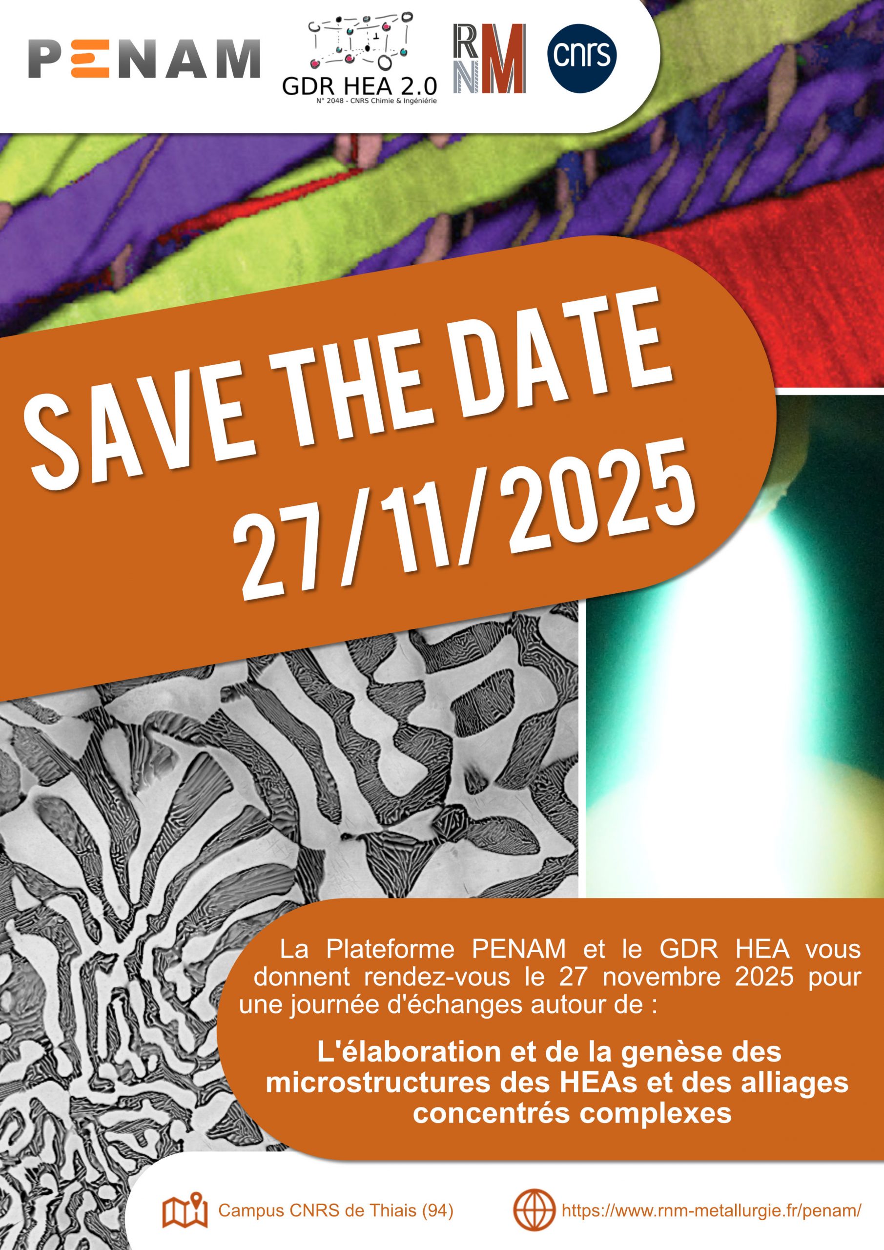La plateforme PENAM organise sa prochaine journée d’échanges le jeudi 27 novembre 2025. La journée est organisée en collaboration avec le GDR HEA et sera l’occasion d’aborder les problématiques d’élaboration et de genèse des microstructures dans ce type d’alliages. Elle aura lieu sur le campus CNRS de Thiais (Val de Marne).